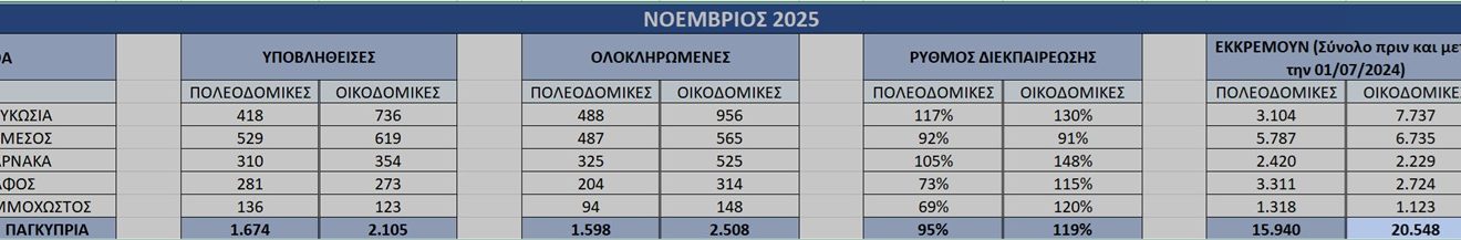 Ο ρυθμός διεκπεραίωσης ανήλθε στο 105% για τις πολεοδομικές αιτήσεις και στο εντυπωσιακό 148% για τις οικοδομικές αιτήσεις, τοποθετώντας τη Λάρνακα στις κορυφαίες θέσεις παγκύπρια ως προς την αποδοτικότητα και την ταχύτητα εξυπηρέτησης.